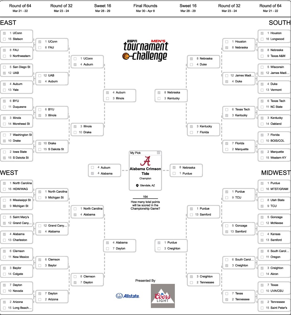 Alabama to win the tournament seems like the popular pick this year since it led the nation in scoring. If it had been a one or two seed I don’t think I would’ve taken it. However, I believe there’s less pressure as a four seed and it can make the run all the way.
